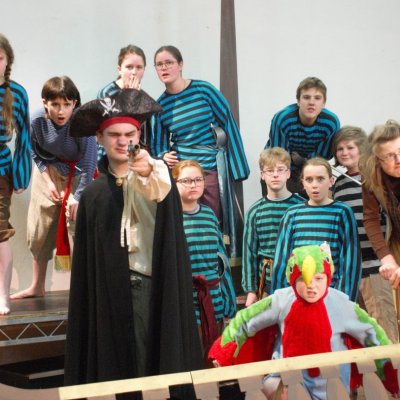 The set designed and constructed by Damian Weedon includes the pirate ship and it is well suited to a large stage. This production has a changed venue from the Playhouse where an upgrade is taking place and Logan Park High School has kindly offered their auditorium. The larger venue has the advantage of social distancing and plenty of free parking. Shows are Tuesday the 29th of September till Friday 3rd October at 11am and 2pm and Saturday and Sunday the 4th and 5th of October at 2pm only All seats are $8 and bookings can be made as usual on the Playhouse answerphone 03 4776544 or online via our Facebook messenger.